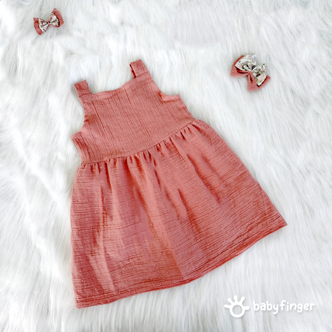 A beautiful and breezy blush pink frock designed for the little fashionistas! This sleeveless dress features a delicate dobby cotton texture with wooden buttons on the bodice and a surprise floral print inner pleat for added flair. Comes with matching floral-accented bows to complete the look. Perfect for summer outings and playful days.