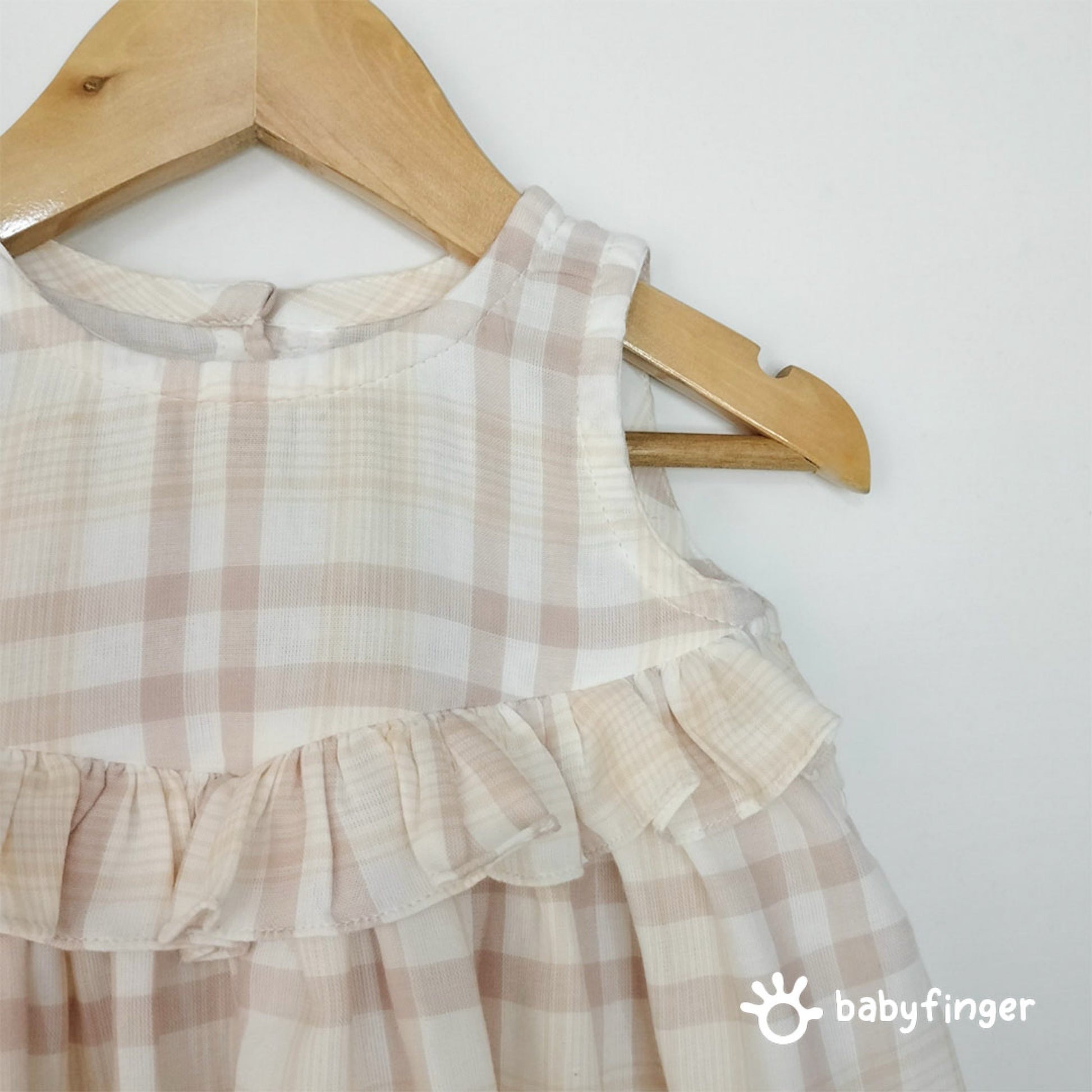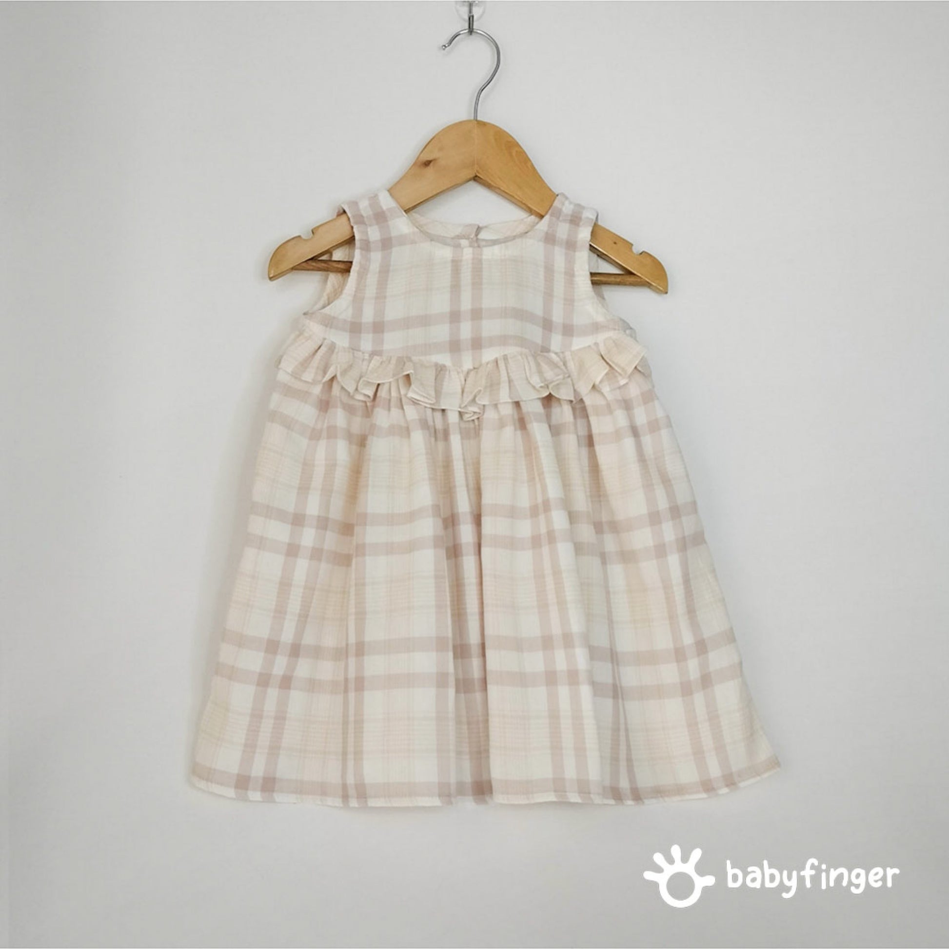 This adorable sleeveless baby dress features a soft beige and cream checkered pattern that gives it a timeless, classic charm. Designed with a comfortable A-line silhouette, it includes delicate ruffle detailing across the chest for a touch of sweetness. The back opens with neat button closures, making it easy to wear and remove. Made from lightweight, breathable fabric that feels gentle on your baby’s skin, this dress is perfect for both everyday outings and special occasions.