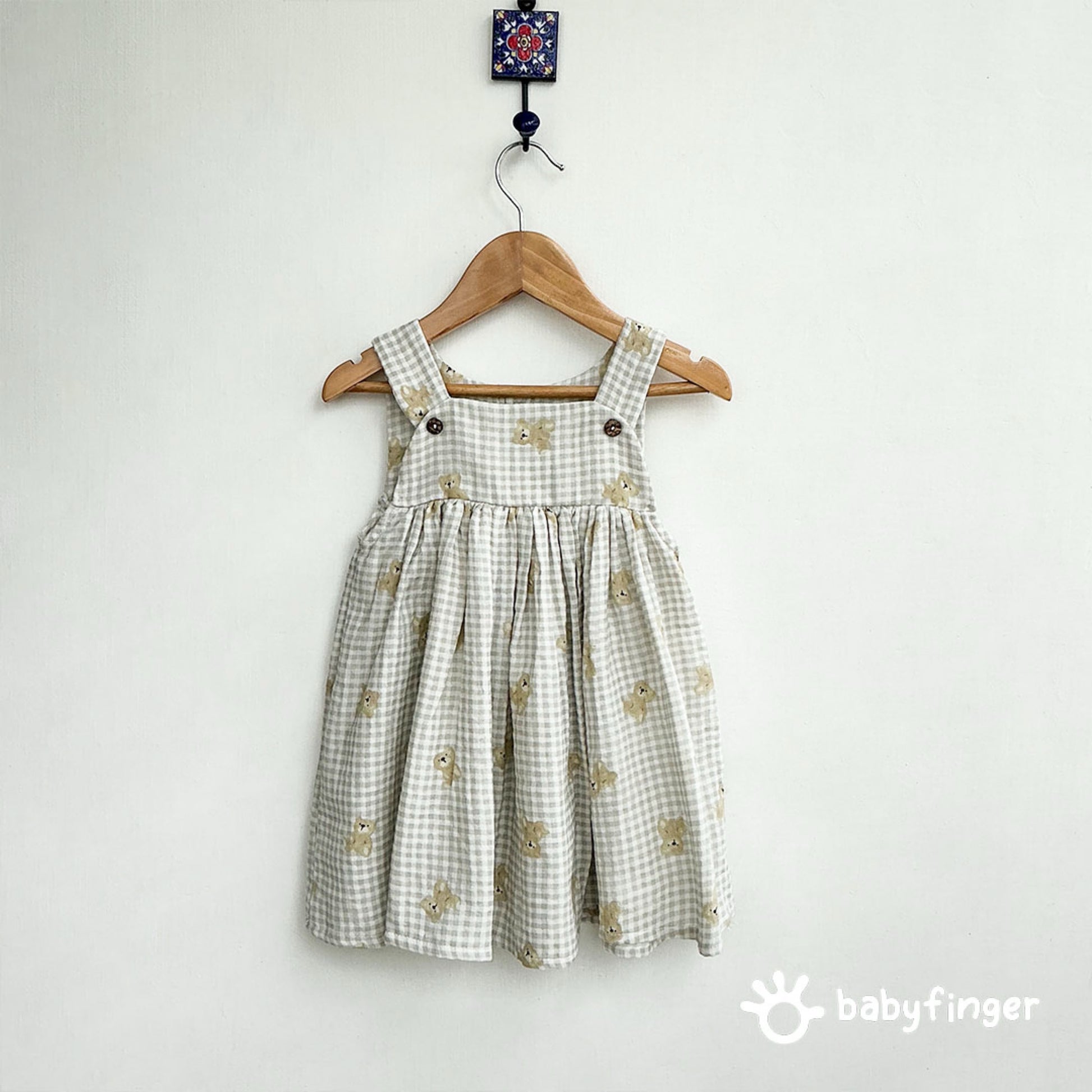 A charming children's smock dress featuring grey and white gingham pattern with adorable light brown teddy bear motifs. Wide adjustable shoulder straps secured with dark brown buttons, gathered waistline creating a full, playful skirt, and a relaxed A-line silhouette. Sleeveless design perfect for warm weather or layering with cute tops. Made from soft, lightweight cotton blend fabric. Knee-length with a sweet, vintage-inspired style that's perfect for everyday wear and playful moments."