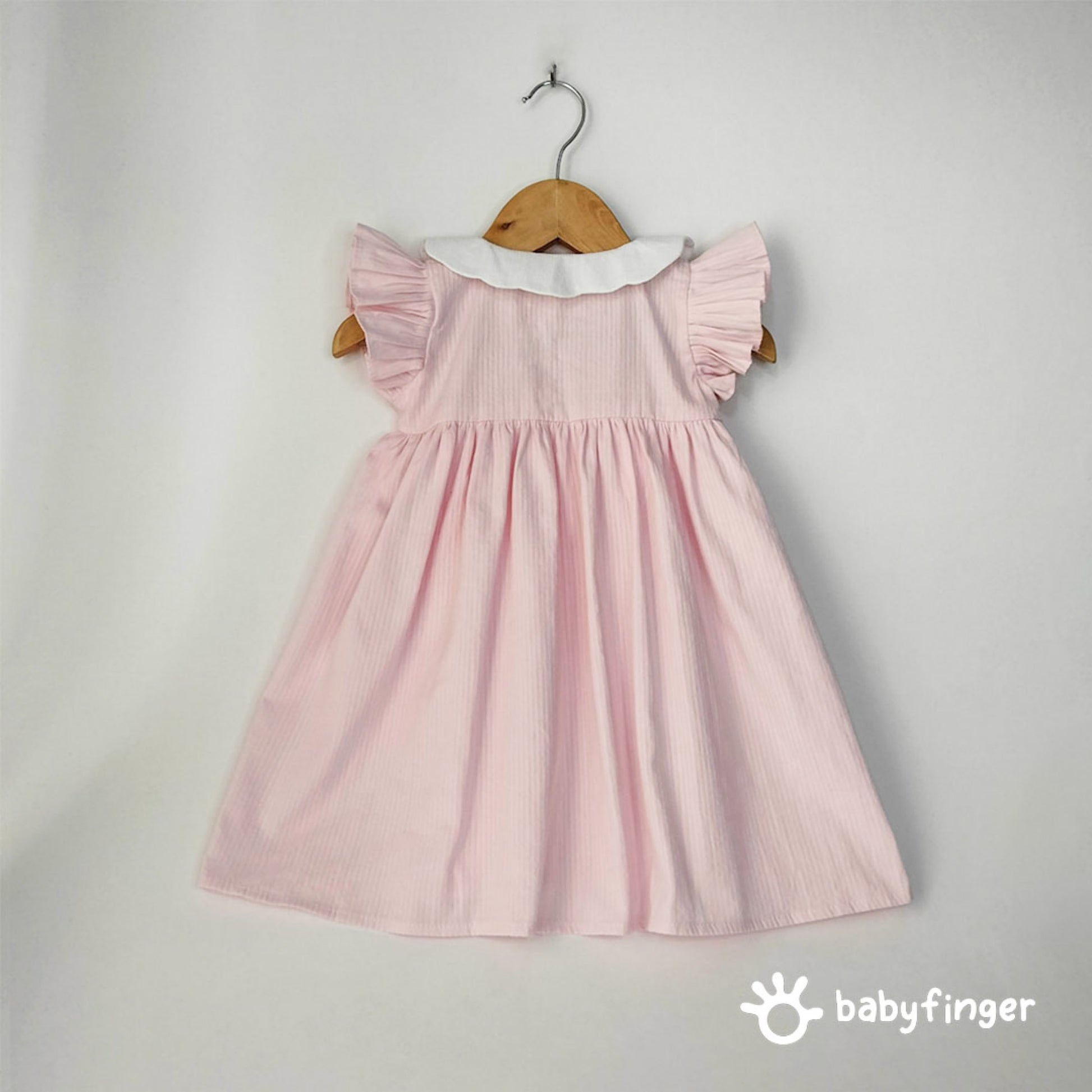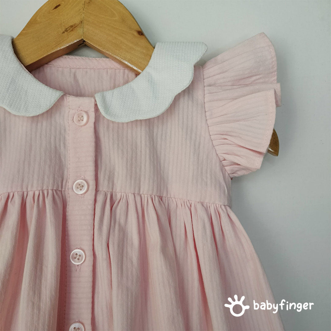 This adorable baby dress is designed in a soft pastel pink shade, perfect for everyday wear or special occasions. It features a charming white Peter Pan collar and front button-down closure for easy dressing. The flutter ruffle sleeves add a cute, playful touch, while the gathered waistline gives the dress a sweet, flared look. Made from breathable cotton fabric, it ensures comfort and softness on your baby’s delicate skin.