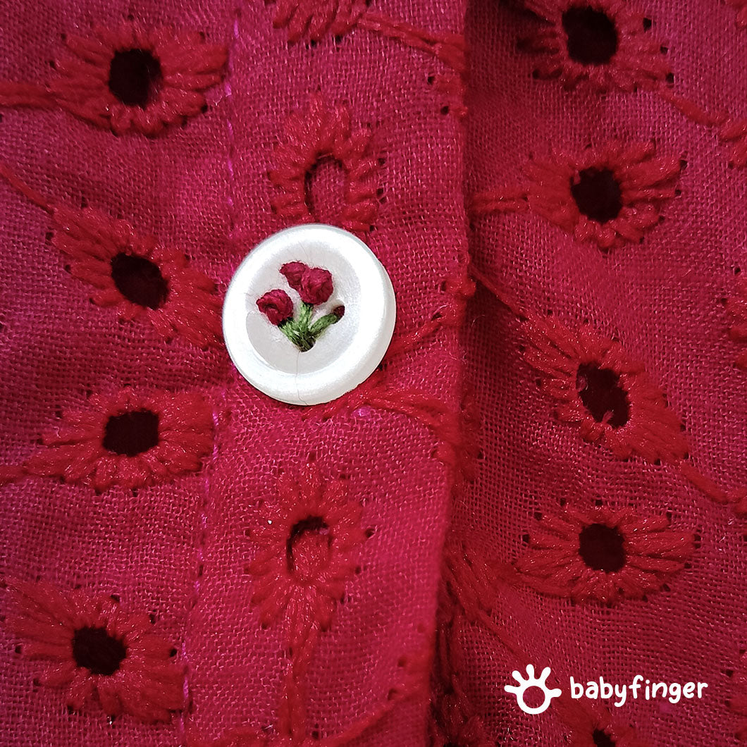 Dress your baby girl in timeless elegance with this Maroon Hakoba Cotton Dress. Made from premium quality Hakoba (eyelet) cotton fabric, this dress features intricate embroidery-style cutwork, perfect for delicate baby skin. The breathable cotton lining ensures maximum comfort, while the rich maroon color makes it an ideal choice for festive and special occasions. Designed to be gentle, stylish, and easy to wear, it’s a must-have addition to any baby girl's wardrobe.